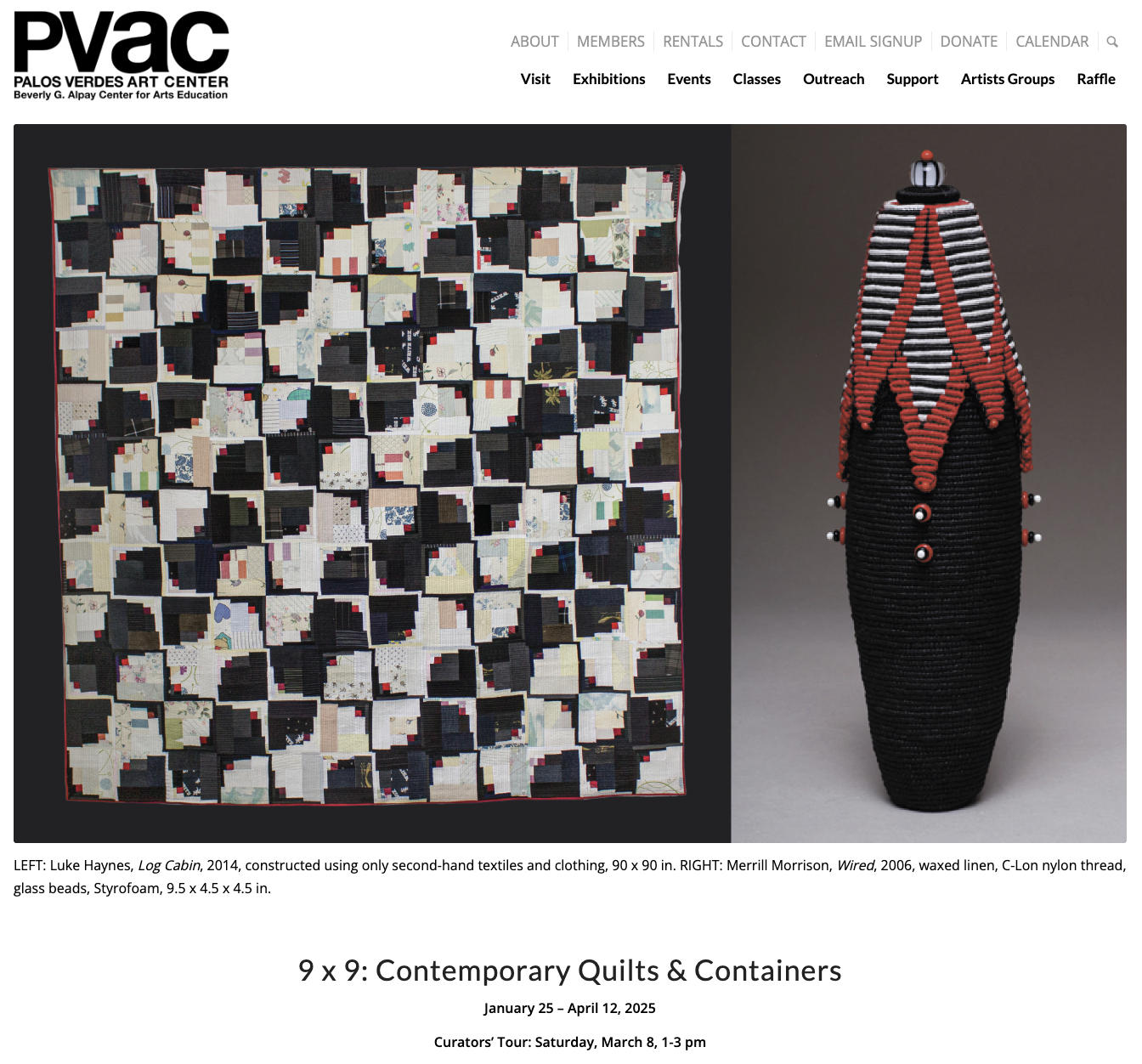 Palos Verdes Art Center opens “9 x 9: Contemporary Quilts & Containers” on January 25, 2025, co-curated by Jo Lauria & Carrie Burckle. The exhibition showcases artworks by 18 distinguished artists from California’s established fiber art community. Presenting innovative interpretations of traditional craft forms, these dynamic quilted, woven, plaited, and twined works investigate the purposes and potential of cross-cultural narratives and techniques through diverse media, expanding our understanding of visual culture. Artists include: Fafnir Adamites, Charlotte Bird, Lavialle Campbell, Joe Cunningham, Barbara Danzi, Lea Feinstein, Luke Haynes, Polly Jacobs Giacchina, Susan Jamart, Merrill Morrison, Kathy Nida, Caitlin Parker, Corine Pearce, Kay Sekimachi, Carol Shaw-Sutton, Karyl Sisson, Elise Vazelakis, and Nicki Voss.